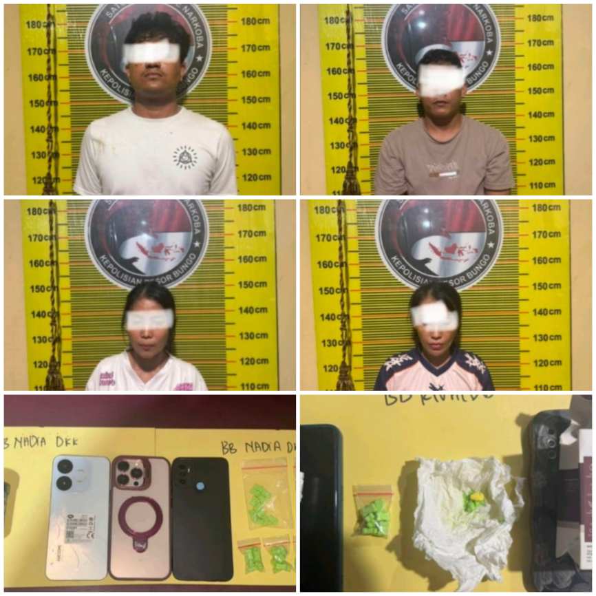 Bungo, sibarnasnews.com – Satresnarkoba Polres Bungo berhasil mengamankan Empat orang yang diduga pelaku penyalahgunaan narkotika jenis ekstasi, ke Empat warga Bungo ini berinisial RJ (25),LH (37), RP (24) dan M (38).